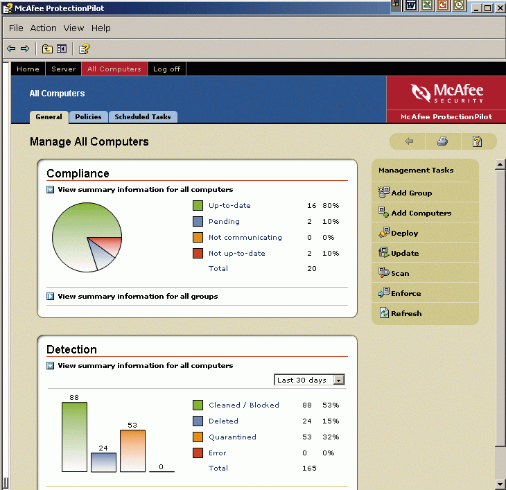 И в MacAfee Active VirusScan Small Business Edition, и в MacAfee Active Virus Defense Small Business Edition реализована недавно разработанная компанией технология ProtectionPilot. Она призвана помочь администраторам в развертывании и сопровождении ПО. Новые элементы по существу представляют собой облегченную версию корпоративного инструментария Network Associates под названием ePO (ePolicy Orchestrator - аранжировщик э-политики), который выполняет функции центральной консоли управления системами безопасности Network Associates.