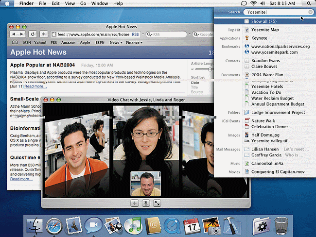 Среди новшеств Mac OS X 10.4 "Тигр" - новая версия iChat, встроенная в браузер Safari функция просмотра RSS-потоков и поисковая система Spotlight