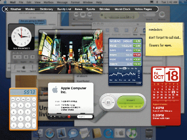 Наконец, было показано новшество в интерфейсе Mac OS X 10.4 "Тигр", получившее название Dashboard. Напоминающая подход, реализованный в любимой многими пользователями Маков программе Konfabulator, подсистема Dashboard позволяет разместить на рабочем столе набор упрощенных "Widgets-программ", выполняющих одну простую функцию (скажем, просмотр курса акций, или показ календаря, или быстрый доступ к адресной книге...). Этот инструмент тесно связан с Expose|, так что получить доступ ко всем активированным Widgets можно одним нажатием клавиши или простым движением мыши.
