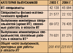 _____ * Эта категория вызывает достаточно много вопросов, поэтому стоит ограничиться первыми тремя. - Прим. ред. Интересно отметить, что в Индии подготовка по собственно ИТ-специальностям поставлена значительно шире (в этом году, по данным NASSCOM, toutsourcingindia. com/india/, - 79 593 человека), однако среди студентов других профилей тех, кто имеет достаточную квалификацию в ИТ, намного меньше, и в результате по общему количеству выпускников, пригодных для работы по этим специальностям, они сильно отстают от нас: 165 121 человек в 2004 г. (73% от нашего уровня). Впрочем, это лишний раз подтверждает универсальность российского образования. |