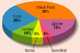 Компания Check Point была основана в Израиле 11 лет назад тремя инженерами и сегодня стала одним из ведущих поставщиков межсетевых экранов и VPN (см. диаграмму). В состав ее центрального семейства продуктов Next Generation входят интеллектуальные решения для защиты периметра корпоративной сети, внутренней защиты и обеспечения безопасности внешних сетей (для бизнес-партнеров).