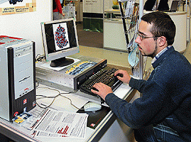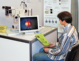 ИПЛИТ РАН демонстрировал разработанный совместно с Международным лазерным центром МГУ им. М. В. Ломоносова офтальмологический диагностический прибор для исследования глазного дна - цифровую мультиспектральную фундус-камеру. Прибор дает возможность получить изображение сетчатки глаза с микронным разрешением. Для компьютерной обработки полученных изображений создано оригинальное ПО. В настоящее время выпущено два экспериментальных макета прибора, один из них испытывается в Университете штата Нью-Мексико (США), а другой - в НИИ глазных болезней РАМН. В начале 2005 г. планируется установить в клиниках еще два макета новой версии прибора. Здесь же демонстрировался лазерный ультразвуковой сканер, предназначенный для диагностики состояния кожных покровов. Как рассказала Дарья Копылова, прибор уже используется в научных исследованиях для оценки распределения неоднородностей в коже и слизистых оболочках с высоким пространственным разрешением (до 200 мкм) на глубине 15 мм.
