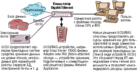 Еще одна весьма привлекательная особенность IP-конфигураций по сравнению с непосредственно подключаемыми устройствами, связанными с одним-единственным сервером, - их способность консолидировать ресурсы хранения в рамках сети.