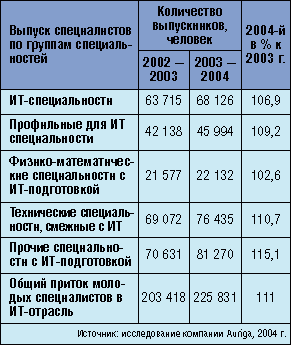 Возникает естественный вопрос: откуда же берутся профессионалы? Среди вузов, готовящих ИT-специалистов, выделяются МГУ им. М. В. Ломоносова (ВМК, мехмат, физфак), МИФИ, МГТУ им. Н. Э. Баумана, Физтех, МАИ, МИИТ, а также ряд региональных университетов. Статистическое исследование компании Auriga (см. таблицу) показывает, что общий кадровый потенциал российской ИT-индустрии, представленный выпускниками вузов, составил к концу 2003/2004 учебного года почти 226 тыс. человек*1, что на 11,1% больше по сравнению с прошлым учебным годом. Однако же многие компании говорят о дефиците квалифицированных специалистов на ИT-рынке.