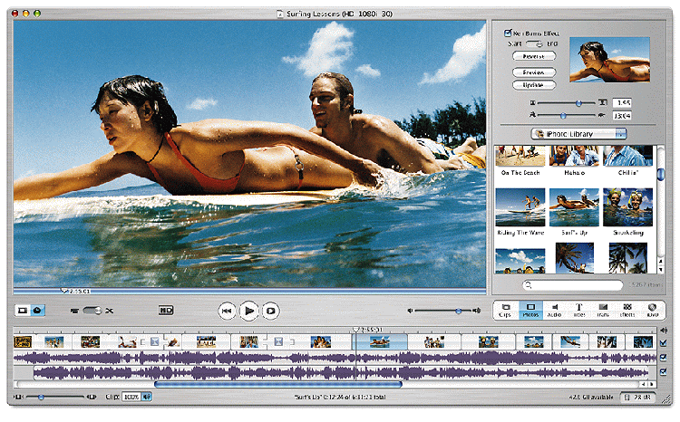 Разумеется, новый вариант iMovie не обошелся без поддержки HD (форматов 720p и 1088i). Среди других новшеств стоит отметить повышение производительности, неразрушающий тримминг, новые переходы и фильтры, поддержку материалов в формате MPEG-4 и новую функцию Magic Movie, автоматически генерирующую готовый фильм из отснятых фрагментов в соответствии с отобранными переходами, фильтрами и видом титров.