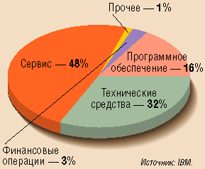 Сергей Яскевич отмечает, что Голубого гиганта правильнее рассматривать не столько как производителя оборудования или разработчика ПО, а прежде всего как поставщика информационно-технологических и консультационных услуг. Об этом свидетельствует и структура его мирового оборота (см. диаграмму). Впрочем, в России доля доходов IBM от оказания разного рода услуг пока значительно меньше, чем в мире. Однако не исключено, что с открытием ЦУП ситуация начнёт постепенно выравниваться.