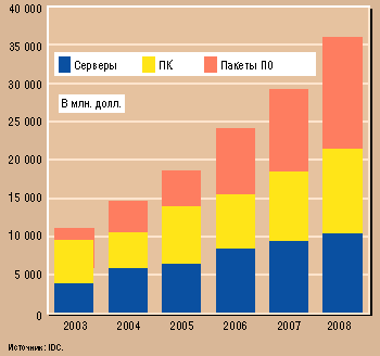 В ее отчете "Worldwide Linux 2004-2008 Forecast: Moving from Niche to Mainstream" также говорится, что суммарные обороты мирового рынка ПК, серверов и пакетов ПО на платформе Linux будут возрастать в среднем на 25,9% в год и к 2008-му достигнут 35,7 млрд. долл. К тому же времени число новых или переоборудованных ПК с ОС Linux увеличится на 17 млн. шт., на что будет затрачено около 10 млн. долл., а их суммарная инсталлированная база достигнет 42,6 млн. единиц.