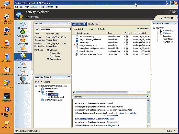 IBM, со своей стороны, представила в конце января на Lotusphere сервис организации и проведения Web-конференций и новый интерфейс Activity Explorer, объединяющий компоненты сотрудничества из комплекта Workplace. Контекстуальное сотрудничество предусмотрено в последних разработках обеих корпораций, однако IBM здесь на шаг впереди: ее новинки определяют присутствие пользователей всех версий Microsoft Office, тогда как сама Microsoft пока ограничивается лишь проверкой Office 2003.