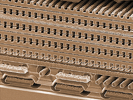 Вообще говоря, для тех областей применения, где ситуация обусловлена все большим сокращением размеров микросхем и уменьшением затрат на их разработку, трехмерная архитектура полупроводниковых устройств позволила бы добиться поразительных преимуществ в цене по сравнению с традиционными. Современные интегральные микросхемы являются двухмерными (часто их называют "планарными") по одной простой причине. Дело в том, что качество кристаллов, нужное для создания самых хороших транзисторов, сохраняется только в подложке или в самой кремниевой основе. Как только на эту подложку наносится изолирующий оксид или связующий металл, становится невозможным последовательное размещение атомов кремния таким образом, чтобы они сформировали требуемую кристаллическую решетку. Необходимый шаблон-подложка оказывается скрытым под этими слоями. В результате традиционные транзисторы создаются только в верхнем слое кремниевой подложки, а пространство над основой используется только для межсоединений. Тем не менее главная мотивация для перехода на трехмерную архитектуру очень проста. Как и в случае с недвижимостью, стоимость кремния напрямую зависит от размера используемой площади (а не от объема). Таким образом, трехмерный метод производства имеет два очевидных преимущества. Во-первых, это существенное снижение цен в расчете на фиксированное устройство и, во-вторых, увеличение числа транзисторов на кристалле со скоростью, не меньшей, чем предусматривает закон Мура в расчете на количество устройств, приходящихся на единицу площади.