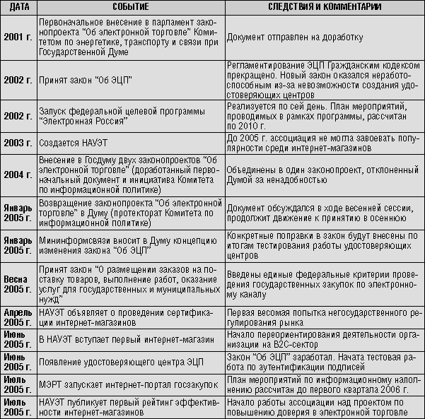 Подводя итоги, можно отметить, что активная работа по регулированию коммерческого Рунета началась. Причем занимаются этим вопросом самые разные организации из самых различных сфер деятельности. Однако ни в одном случае перечисленным инициативам нельзя предсказать стопроцентную гарантию успеха. С уверенностью можно лишь отметить, что конец 2005 г. и начало 2006-го станут горячим временем для участников электронной торговли в России.