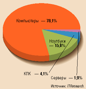 Общий объем рынка компьютеров (ПК, ноутбуки, КПК, серверы на платформе Intel) в I полугодии 2005 г. составил 2380 тыс. шт. Около 78,1% продаж в натуральном выражении приходится на настольные ПК, 15,8% - на ноутбуки, 4,1% - на карманные компьютеры (КПК) и примерно 1,9% - на серверы стандартной архитектуры.