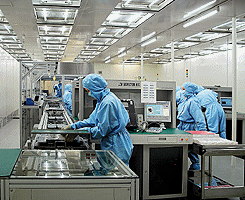 На заводе "Микрон" в подмосковном Зеленограде в "чистых комнатах" налажена сборка ЖК-панелей. Готовую стеклянную подложку, рамку и люминесцентные лампы подсветки здесь объединяют в единую конструкцию. Зачем в "чистых комнатах"? Из-за эффекта лупы зрительный размер частицы, попавшей под стеклянную подложку, увеличивается в несколько раз. Поэтому в камере, где стекло готовится к работе, поддерживается уровень чистоты воздуха 100 частиц на кубический метр, а люди работают в специальных костюмах. На линии завода "Микрон", которая действует в три смены, планируется выпускать до 1000 панелей в сутки.