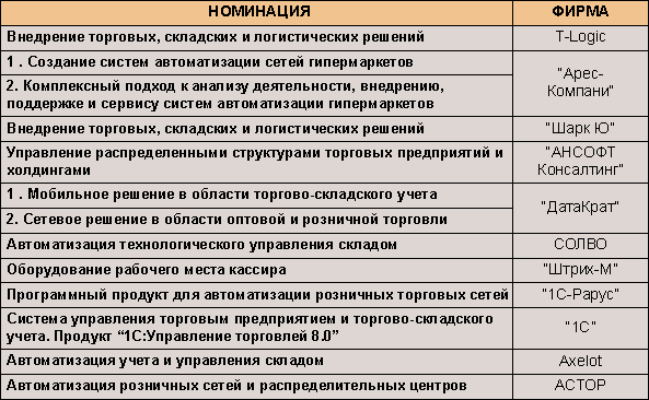 Ярким событием выставки стало вручение наград победителям конкурса лучших решений в области торговых, складских и логистических технологий "Золотой купец". Среди ИТ-компаний, ставших лауреатами (см. таблицу), оказались как завсегдатаи выставки, так и новички.