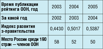 Продолжаем серию ежегодных обзоров, посвященных становлению информатизации в России (см. PC Week/RE, N 2/2003, с. 31, и N 8/2004, с. 38; БОСС IT, N 1/2005, с. 5). Удивительно: в то время как позиции нашей страны в глобальных рейтингах по экономической свободе, коррупции, образованию и т. д. год от года ухудшаются, в рейтингах развития электронного правительства они, напротив, улучшаются, по крайней мере в последние три года (см. таблицу). Вообще индекс развития э-правительства формируется из трех показателей (см. врезку "Показатель из трех частей "). Индекс человеческого капитала у нас падает, значит, рост индекса э-правительства обеспечивается за счет увеличения числа Web-сайтов государственных органов власти и развития телекоммуникационной инфраструктуры. Последнее подтверждается, в частности, исследованиями компьютеризации семнадцати передовых стран мира в рамках проекта Pew Global Attitudes Project (pewglobal.org/reports/display.php?ReportID=251; см. также статью "Быстрее только Англия. По темпам компьютеризации Россия уже обогнала Индию и США". - "Коммерсант", N 36, 2 марта 2006 г.), из которого следует, что по темпам роста количества пользователей ПК (более 5% в год) Россия оказалась на втором месте после Великобритании. Но здесь не нужно слишком обольщаться. Просто в России компьютеризация еще не достигла насыщения, как, к примеру, в США. А вот с сотовыми телефонами это уже случилось, и рост количества новых абонентов мобильной связи России замедлился, что сократило число показателей, которыми министр информационных технологий и связи РФ Леонид Рейман может гордиться на встречах с президентом.
