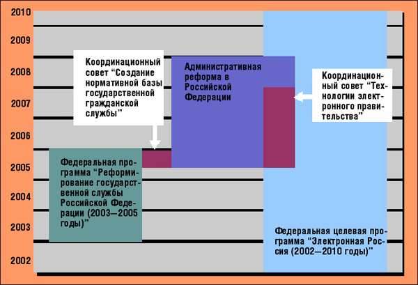 Административная реформа идет в стране несколько лет, но только с нынешнего года она будет проходить в рамках ФЦП. И вот то, что в бизнесе было нормой - реинжиниринг бизнес-процессов перед внедрением ИТ, - стало для чиновников открытием, и они решили гармонизировать осуществление нового этапа административной реформы (ar.economy.gov.ru) и программы "Электронная Россия" (er.economy.gov.ru, см. рисунок).