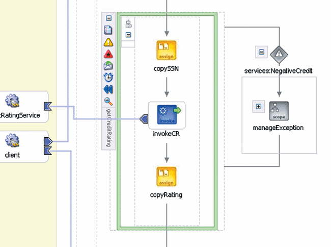 Во время прошедших заседаний OASIS я побеседовал с представителями ряда компаний, которые обрисовали мне будущий облик своих BPEL-инструментов. BPEL-редактор для NetBeans фирмы Sun Microsystems, впервые представленный на майской конференции JavaOne, способен на основе недолгой и интуитивно понятной процедуры визуального описания взаимодействий и задания нужных значений ключевых параметров генерировать большие объемы сложных XML-конструкций. В нем заложен ряд действительно оригинальных идей по организации визуального взаимодействия с крупномасштабной XML-схемой. Советуем разработчикам также опробовать бесплатный BPEL Designer корпорации Oracle (см. рис.).