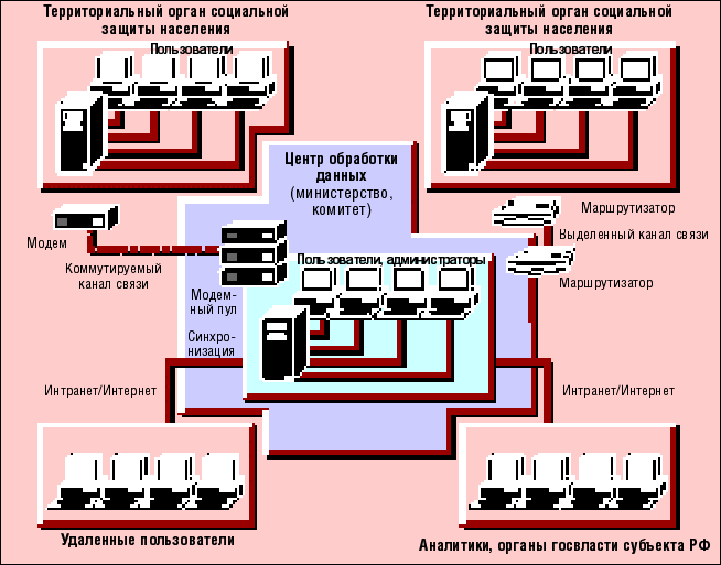 В целом к 2005 г. в нормативной базе и практике административного устройства сложилась совокупность возможностей и ограничений, четко очерчивающая границы и структуру АИС "Социальный регистр населения". Эта система должна охватывать два организационных уровня устройства органов социальной защиты (региональный - департамент/министерство и муниципальный - территориальный орган регионального ведомства, обычно преобразованный из муниципального управления социальной защиты населения) и обеспечивать автоматизацию деятельности сотрудников этих уровней с целью реализации единого персонифицированного учета и организации работы ведомства (планирование, контроль исполнения, отчетность) на базе актуального и достоверного массива информации.