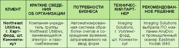 "На протяжении года с лишним, - вспоминает Жак, - мы множество раз встречались с различными интеграторами и производителями, чтобы посмотреть, какое ПО лучше всего будет соответствовать нашим потребностям". Компания AnyDoc, занимающаяся автоматизированным вводом документов и данных, рекомендовала Northeast Utilities, по словам Винни Чероне, вице-президента Imaging Solutions по операциям, воспользоваться услугами своего местного интегратора Imaging Solutions на самом раннем этапе закупок. По итогам переговоров NU в конечном счете остановила свой выбор на AnyDoc и Imaging Solutions.