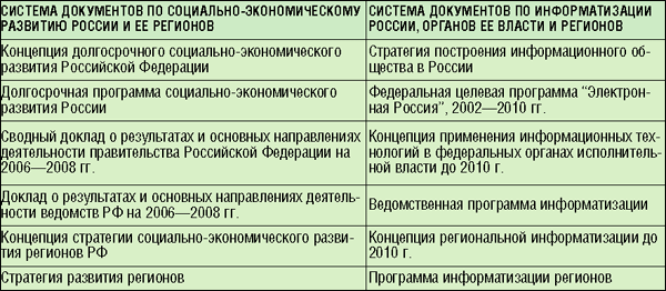 Таким образом, мы видим (см. таблицу), что в стране построена довольно стройная система документов по социально-экономическому развитию России и ее регионов, с которой вполне соотносится система документов по информатизации. Главная проблема, однако, состоит в том, что пока правительство не считает развитие информационно-коммуникационной инфраструктуры страны элементом ее социально-экономического развития и рычагом решения социально-экономических проблем (сокращения безработицы, вовлечения в общественный труд пенсионеров, подростков и домашних хозяек, "донесения" до удаленных уголков страны медицинской и другой экспертизы и др.).