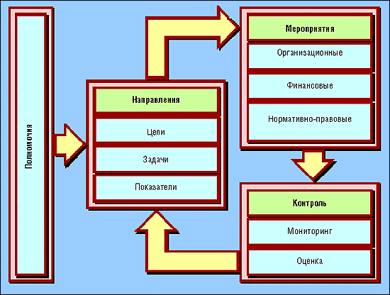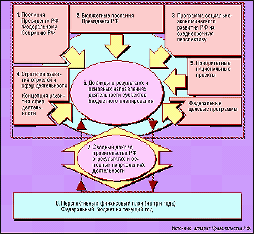 Стремясь повысить эффективность комплексного среднесрочного планирования деятельности органов исполнительной власти, правительство РФ 27 апреля 2005 г. приняло постановление "Об утверждении Положения о разработке сводного доклада о результатах и основных направлениях деятельности правительства Российской Федерации на 2006-2008 годы" (http://npa-gov.garweb.ru:8080/public/default.asp?no=88124). В рамках реализации механизмов бюджетирования, ориентированного на результат, сформированы институт ведомственных целевых программ, а также институт докладов о результатах и основных направлениях деятельности субъектов бюджетного планирования федеральных министерств и администраций регионов.