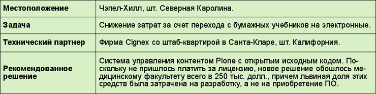 Как отмечает Чарли Хитлин, менеджер по разработке приложений и мультимедийных сервисов медицинского факультета, ставка на открытые коды дала немалую экономию, поскольку университету не пришлось покупать лицензии. Кроме того, опыт внедрения такого ПО мог пригодиться другим факультетам. Хотя университет поддерживает сайт ibiblio.org - одно из крупнейших зеркал известного Web-узла SourceForge, посвященного программам с открытым кодом, однако до последнего времени подобными приложениями почти не пользовался.