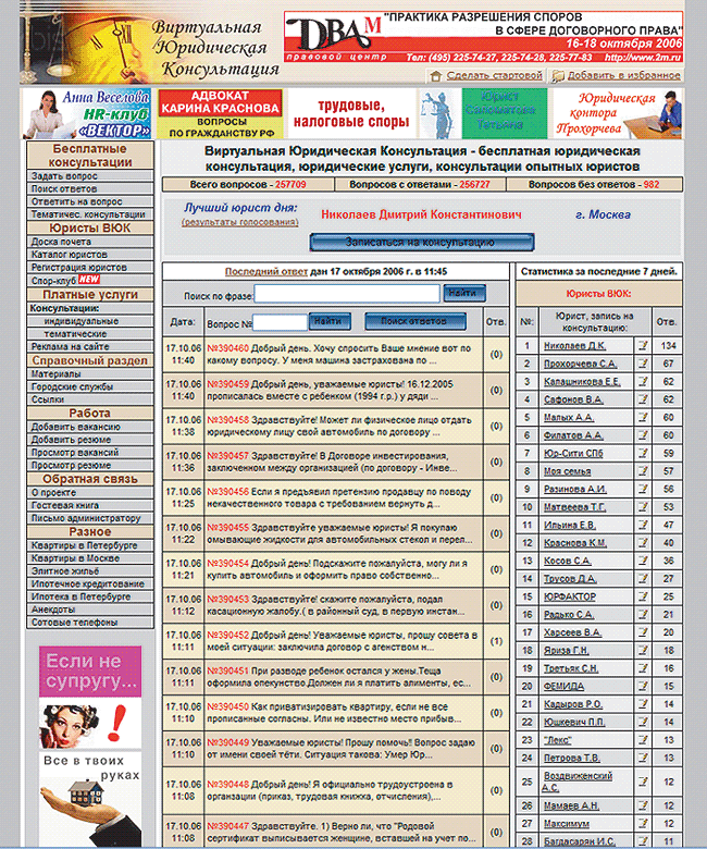 Всего в работе с посетителями сайта принимают участие более шестидесяти юристов. По каждому из них можно найти небольшое досье, в котором содержатся такие данные, как имя, адрес, телефон, e-mail, образование, место работы, должность, стаж, специализация, дата регистрации на сайте, количество данных ответов и полученных благодарностей. Последние два пункта в анкете снабжены ссылками, и пользователь может сам ознакомиться с результатами работы юриста на сайте. Если квалификация специалиста произвела впечатление, к нему можно записаться на очную (платную) консультацию.