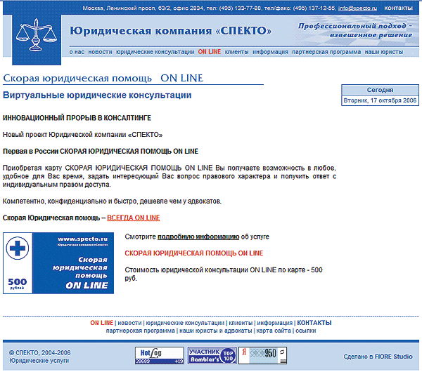 Фирма “Cпекто” в настоящее время продвигает проект “Скорая юридическая помощь ON LINE”