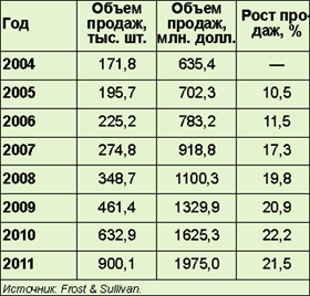 В последнее время рынок визуальных коммуникаций, по словам президента Tandberg по EMEA, развивается очень динамично. Так, по оценкам независимых аналитических компаний Wainhouse Research и Frost & Sullivan, объем мирового рынка ВКС сегодня составляет более 1 млрд. долл., причем прогнозируемые темпы роста с 2005 по 2011 гг. составляют в среднем 18% (см. таблицу).