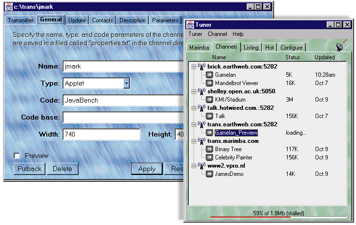 Апплеты и любые ассоциированные данные называются на жаргоне Castanet-каналами. Tuner функционирует на ПК пользователя и связывается с серверами, на которых работает Transmitter.
