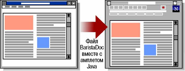 Второй компонент представляет собой апплет Java, который для файла BaristaDoc выступает в качестве кросс-платформной программы просмотра. Когда пользователь Web переписывает из сети файл BaristaDoc, сопутствующий ему апплет Java автоматически показывает документ на экране. Документы Barista могут быть предоставлены любой программе просмотра Web, работающей с Java; при этом программе просмотра не нужно иметь никаких дополнительных модулей.