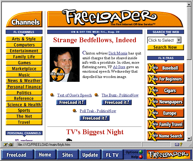 Freeloader, бесплатная программа, поддерживаемая рекламодателями, может быть загружена с адреса http://www.freeloader.com. Она работает примерно с 20 популярными браузерами, предоставляя пользователям возможность подписываться на отдельные узлы Web в процессе блужданий по Internet. Выбранные пользователем Web-узлы затем автоматически загружаются на винчестер и программно обновляются по определенному пользователем графику. Пользователи могут классифицировать данные с различных Web-узлов по одной из 15 категорий (компьютеры, развлечения, семья, политика и так далее) или же по категории, определенной самим пользователем.