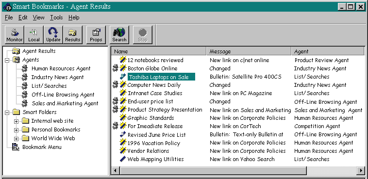 Некоторые из оффлайновых Web-браузеров также могут быть сконфигурированы для отслеживания изменений страниц Web. Например, Smart Bookmarks автоматически кэширует страницы, содержимое которых изменилось, на локальных носителях. “Имеется очевидная возможность оптимизации пропускной способности для персонала ИС. Агент может быть запущен в два часа ночи и будет кэшировать страницы, необходимые сотрудникам”, сказал Беркоу. Smart Bookmarks также имеет интерфейс к поисковым механизмам, с помощью которого пользователи могут задать в оффлайновом режиме запрос, посылаемый затем одновременно на Yahoo, Lycos и другие механизмы поиска. Может быть установлен агент для отслеживания и повторных запусков через определенные интервалы времени с извещением пользователей о получении новых результатов.