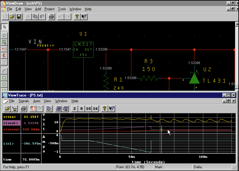 ViewSpice - моделирование аналоговых устройств. Имеется возможность выбора одной из программ моделирования стандарта SPICE: ViewSpice, HSpice, Dracula, SPICE 2G6 и ATT Wirelist. Поддерживается стандартный набор видов анализа (режим по постоянному току, частотные характеристики, переходные процессы, спектральный анализ, анализ шумов), за исключением параметрической оптимизации и статистического анализа. Графики результатов моделирования отображаются с помощью ViewTrace. Возможен динамический вывод графиков в процессе моделирования. Удобно, что результаты расчета в режиме по постоянному току отображаются непосредственно в узлах схемы (рис. 5).