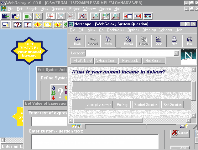 Типичное приложение WebGalaxy начинается с экрана, который задает вопрос и передает управление другим экранам в зависимости от ответа пользователя. Этот ответ может представлять собой выбор между предопределенными ответами или ввод в свободной форме, что требует программной логики для выполнения сравнений, поиска в базе данных или других операций. Все эти средства имеются в диалоговых окнах WebGalaxy (см. рис.).