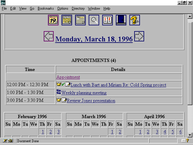 Программа OnTime Web Edition фирмы Campbell Services (Саутфилд, шт. Мичиган) проложила первую тропинку между ПО планирования и World-Wide Web, предоставив пользователям простой способ проверять - но не изменять - по Internet свои календарные планы.