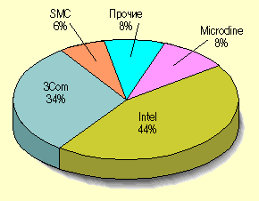 Доля же Intel в выпуске адаптеров Fast Ethernet весьма внушительна. По данным IDC (март 1996 г.), мировой “пирог” в этом секторе рынка выглядит следующим образом: Intel - 44%, 3Com - 34%, Microdine - 8%, SMC - 6%, прочие фирмы - 8%. Но корпорация не останавливается на достигнутом: недавно она выпустила модульный концентратор 100BaseTX Express Stackable Hub и коммутирующий концентратор Express Switching Hub, закончив тем самым создание полного решения для рабочих групп, использующих Fast Ethernet. Завершая пресс-конференцию, ее организаторы выразили мнение, что новых сюрпризов со стороны адаптера EtherExpress PRO/100В в ближайшее время не предвидится, но компьютерную прессу надо читать регулярно.