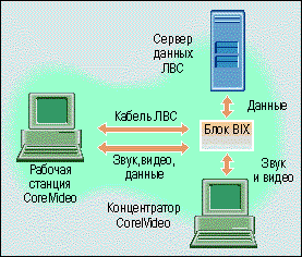 На каждом ПК пользователя внешняя аппаратная консоль CorelVideo обрабатывает весь трафик видео- и звуковых сигналов, принимая входной сигнал от видеокамеры Corel и передавая звуковые и видеосигналы на установленную в ПК карту наложения видеоизображения.