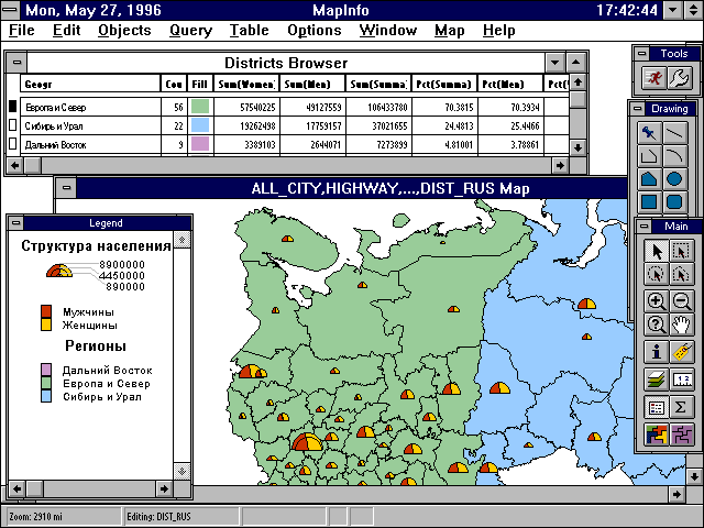 В MapInfo возможно прямое использование данных в форматах Lotus 1 - 2 - 3, Excel, dBase, причем созданные для них "таблицы" (Tables) рассматриваются как файлы MapInfo и загружаются в дальнейшем без повторного форматирования. "Таблица" может быть визуализирована на экране, в соответствующих окнах, как слой карты (если у нее есть графическая составляющая), электронная таблица и в виде графиков разных типов. Следует особо отметить расширенные возможности картографической визуализации данных в этом пакете по сравнению с конкурирующими. Однако стремление обеспечить пользователя максимумом функций приводит к переполнению предела "стройности" программы; некоторые неожиданные неудобства смазывают общее хорошее впечатление. Вместе с MapInfo можно приобрести язык MapBasic для создания собственных ГИС-приложений.