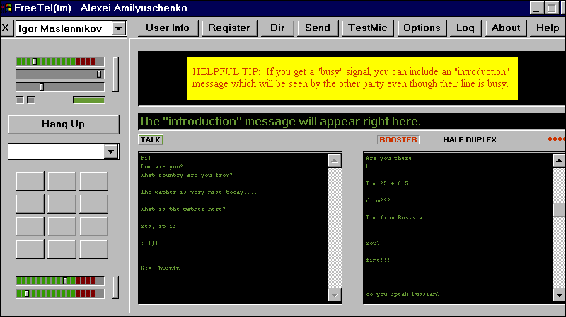 В ходе знакомства с этими средствами в офисе CompTek (использовалась голосовая плата фирмы Dialogic и модемное подключение к Internet на скорости 28,8 Кбит/с) удалось поговорить с самыми разными людьми из разных уголков земного шара: с отставным летчиком из шт. Мичиган, бизнесменом из Южной Африки и австралийским школьником (он написал в окошке диалога, что не может говорить, потому что находится на уроке. Видимо, украдкой от учителя развлекается компьютерной телефонией на своем личном ноутбуке).