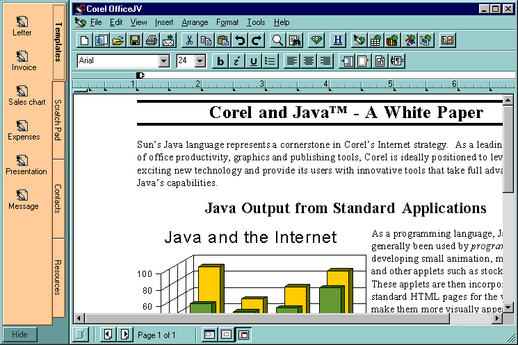Кроме того, на базе Java корпорация Corel разрабатывает еще одну новинку - Corel Barista. Эта технология даст пользователям входящих в комплект Corel Office Professional приложений WordPerfect 7 и Corel Ventura 7 возможность создавать документы, основанные полностью на технологии Java, без всякого программирования. Она позволяет издателям осуществлять полный контроль над тем, как будет выглядеть страница документа, а в будущем включит в себя интерактивные и мультимедийные возможности. Документы Corel Barista можно переносить на другие платформы, они также и совместимы с любой программой просмотра, поддерживающей Java.