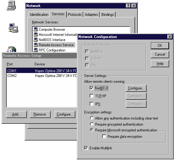 Выберите протоколы, с которыми клиенты смогут работать при удаленном соединении (см. рис. 3). Затем повторите то же для второго модема, чтобы создать соединение “точка - точка”. Теперь установите опцию Enable Multilink (Допускается многосвязность), выйдите (щелкнув на Exit) и сохраните изменения (щелкнув на Save).