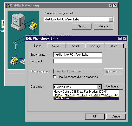В окне Edit Phonebook Entry выберите в ниспадающем меню Dial строку Multiple Lines (Множественные линии) и нажмите кнопку Configure.