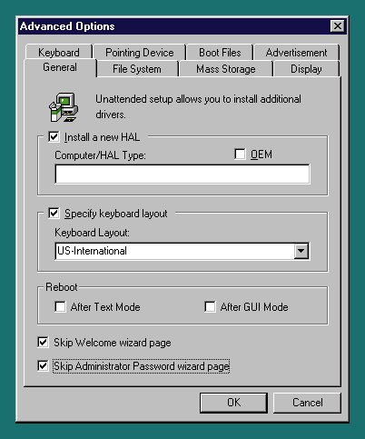 Выберите окно Advanced Options (Дополнительные опции). Пользуясь им, вы можете отключить Welcome Wizard (Мастер приглашения) и Administrator Password Wizard (Мастер пароля администратора) - хорошая идея, так как в этом случае начальная установка сможет выполняться в автоматическом режиме. Advanced Options также позволяют администраторам выбирать дополнительные параметры, такие, как File System (Файловая система) и Keyboard Layout (Раскладка клавиатуры). По окончании нажмите OK.