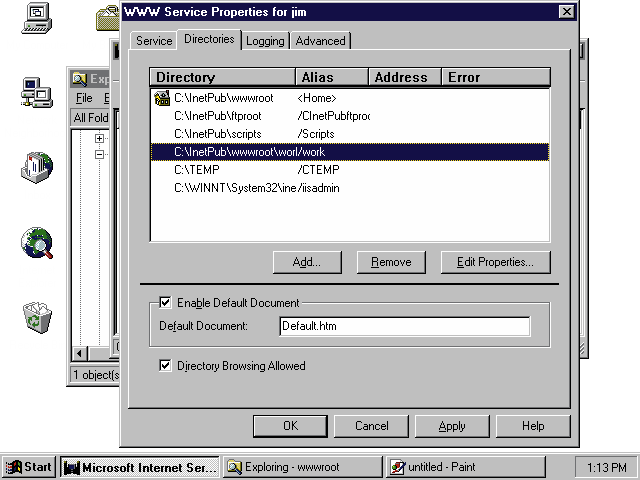 Конфигурация. После того как инсталляция завершена, все управление производится через Internet Service Manager (Диспетчер служб Internet), который может быть запущен в виде стандартного ГИП-приложения, но доступен также и через программу просмотра Web. Те параметры, которые устанавливаются по умолчанию, удовлетворят большинство пользователей, но для каждого имеющегося Web-узла потребуется переконфигурировать отображение каталогов (см. рис. 9). Добавление каталогов производится очень просто. Атрибуты каталога (например, признак того, что он будет функционировать как виртуальный сервер) также можно легко поменять. Последний шаг при задании конфигурации - решить, как будут храниться журналы регистрации деятельности узла и сколько данных будет регистрироваться. IIS позволяет пользователям создавать журналы регистрации в виде файлов или сохранять регистрационную информацию в СУБД через ODBC.