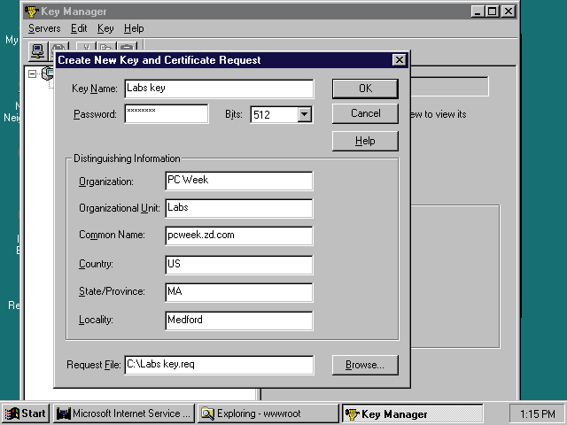 Безопасность. Для опытных пользователей NT управление доступом к Web-узлу под IIS покажется чрезвычайно простым, так как IIS использует списки контроля доступа самой NT. Для тех администраторов, которые пожелают использовать на своих узлах защищенные соединения на базе протокола Secure Sockets Layer (SSL), предусмотрена следующая четырехступенчатая процедура. Сначала нужно сгенерировать ключ для каждого сервера (см. рис. 10), затем послать эту информацию в агентство сертификации, например Verisign (вместе с требуемой оплатой), установить присланный из Verisign сертификат и, наконец, определить, какие HTML-страницы или каталоги будут использовать SSL.