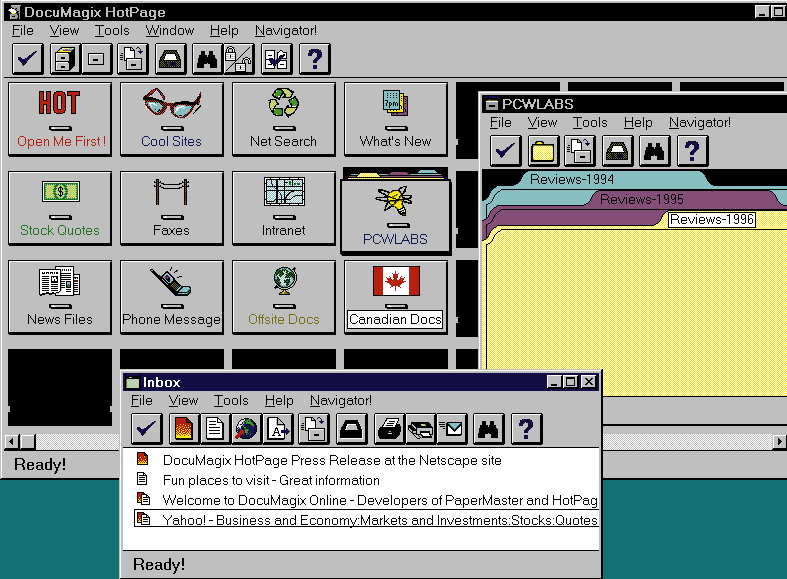 Программа HotPage ($79) использует тот же самый пользовательский интерфейс, основанный на метафоре шкафа с выдвижными ящиками, что и ПО управления документами PaperMaster фирмы DocuMagix. Пакет тесно интегрирован с программой Navigator корпорации Netscape Communications, он автоматически вставляет себя в строку меню браузера в процессе установки.