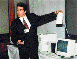 Их показ начался с демонстрации самого легкого (масса около 2 кг) и самого тонкого (3 см толщиной в сложенном виде) ноутбука ThinkPad 560 (см. PC Week/RE, № 35/96, с. 24 и № - 30/96, с.17) и специально сконструированной для него "дамской сумочки" с отделением для внешнего флоппи-дисковода. По мнению специалистов IBM, для обмена информацией с другими ПК гибкие диски уже морально устарели, и пользователям пора привыкать к инфракрасному порту, который становится непременным атрибутом всякого уважающего себя компьютера. ThinkPad 560 - отличная "игрушка" для мобильных пользователей, которые не имеют автомобиля и передвигаются преимущественно на своих двоих. О российских ценах на этот блокнотный ПК организаторы семинара умолчали ввиду их (цен) большого разброса.