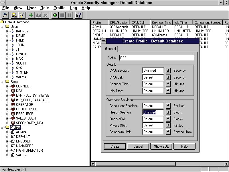 Однако ни SQL Server, ни Database Server не обладают гибкостью сервера Oracle 7.3, который позволяет администраторам создавать профили для групп пользователей в целом.