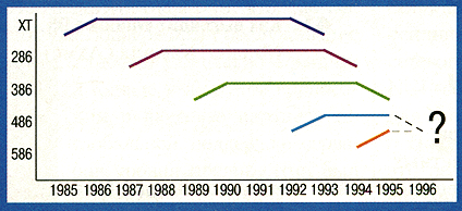 И что же остается пользователю? Неужели безропотно следовать за линией, проводимой производителями? Может быть, стоит вспомнить, что компьютер это не только мерило престижа, но еще и рабочий инструмент? Конечно, трудно устоять перед новой привлекательной версией ну совсем передового ПО, работающего только на суперсовременнейшем ПК. Еще хуже, когда при встрече свой же брат пользователь с удивлением в глазах вопрошает: "Как, у тебя не "пентиум", не 32 мегабайта ОЗУ? Как, у тебя нет СД-рума с учетверенной скоростью?" - и удивление в его глазах переходит во что-то такое... Вот тогда становится совсем тяжело. А тут еще Intel не очень-то и скрывает свои намерения полностью ликвидировать рынок 486-х и загнать всех в счастливое "пентиумное" будущее. Хотя с Intel как раз все понятно. Остальные производители процессоров заметно отстают: так, АМД только недавно начала выпускать аналог "пентиума" - К5. А у Intel уже Р6 "за пазухой". Вот только как этот гигант планирует один удовлетворить всех производителей ПК? Ведь запросто может получиться, как с микросхемами памяти при увеличении размера стандартного ОЗУ, воспоминания об этой эпопее очень свежи. И не потянет ли Intel всех нас еще дальше, хотя бы в Р6, когда остальные производители процессоров твердо освоят цифру 5. Так что, гонки на выживание?