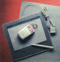 Дополнительное чувствительное к давлению устройство перьевого ввода для Drawing-Slate II (по цене $110) хорошо себя показало во время тестов с применением пакета Painter 3.0 корпорации Fractal Design. Это устройство позволило нам использовать чувствительность Painter к давлению. Например, если мы сильнее прижимали устройство перьевого ввода к планшету, толщина линии, отображаемой программой, увеличивалась.